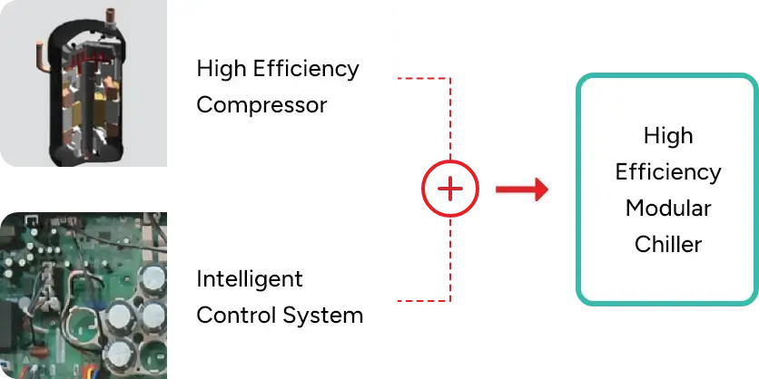 R32 Modular Chiller features cutting-edge DC inverter technology and premium components from reputable brands, all rigorously tested to ensure optimal compatibility and reliability. Its design and configuration are meticulously optimized to deliver outstanding performance. Equipped with energy-efficient inverter compressors, finned tube heat exchanger, and electronic expansion valves, this chiller achieves exceptional efficiency and superior performance