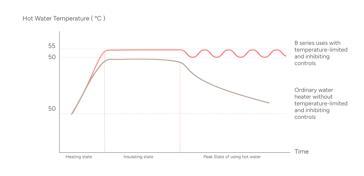 Compared to conventional solar heaters, users may run out of hot water when demand exceeds supply. A5MHA controls both the tank temperature and water level, ensuring a stable temperature for users even during continuous use.